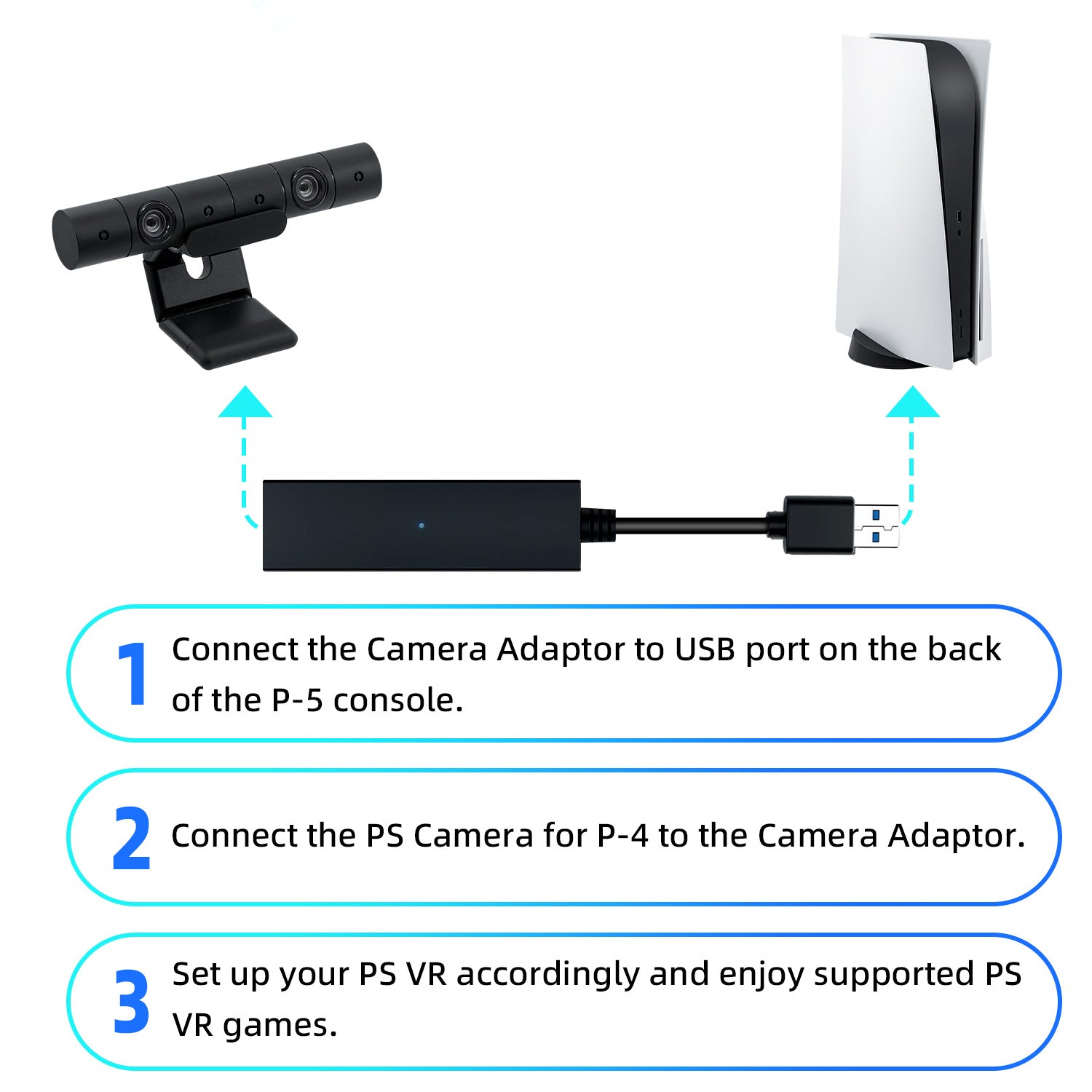 -Easy to use. Simply connect the adapter to the USB port of the PS5 console and connect the PS Camera for PS4 to the adapter. Then set up your PS VR accordingly. Enjoy the game now!